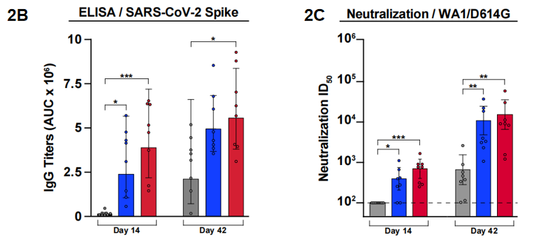 S-EABR eVLP引发了针对S蛋白受体结合域(RBD)的有效抗体反应(图S2C),S蛋白是抗SARS-CoV-2中和抗体的主要靶标。还通过斑块减少中和试验(PRNT)评估了血清对真实的SARS-CoV-2的反应,显示出对SARS-CoV-2 WA1的强大中和活性(图S2D)。中和滴度下降对SARS-CoV-2β和德尔塔变异株的抵抗力分别为2倍,这与编码SARS-CoV-2-WA1S蛋白的许可疫苗的研究一致。这些结果表明,纯化的S-EABR eVLP可在体内引发有效的免疫反应,并代表了一种生产纳米颗粒疫苗的替代技术,该疫苗不涉及洗涤剂介导的细胞裂解和从细胞裂解物中分离膜蛋白抗原。