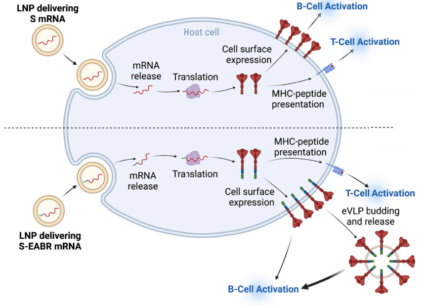 与现有的基于纳米颗粒的疫苗方法相比,EABR-eVLP技术的一个关键优势是S-EABR构建体可以很容易地作为mRNA疫苗递送,因为eVLP组装和细胞表面表达都只需要表达单个基因编码的成分。虽然传统的新冠肺炎mRNA疫苗通过S蛋白的细胞表面表达诱导抗体反应,信使核糖核酸介导的S-EABR构建体的递送可以增强B细胞的激活,因为S-EABR蛋白不仅会在细胞表面表达,还会诱导从细胞中出芽并分布在体内的eVLP的组装,以激活免疫细胞。