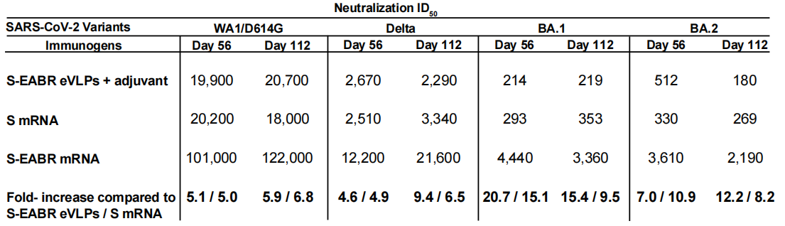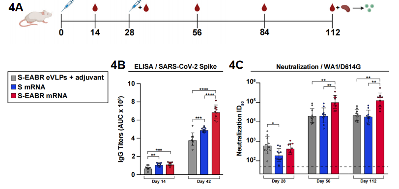 S-EABR mRNALNP的几何平均中和滴度分别比纯化的S-EABR eVLP和S mRNA LNP引发的滴度高5.1倍和5倍(图4C和4D)。增强后3个月(第112天),与纯化的S-EABR eVLP和S mRNA LNP相比,S-EABR mRNA LNP的平均中和滴度分别高5.9倍和6.8倍,表明血清中和活性的增加是持续性的。