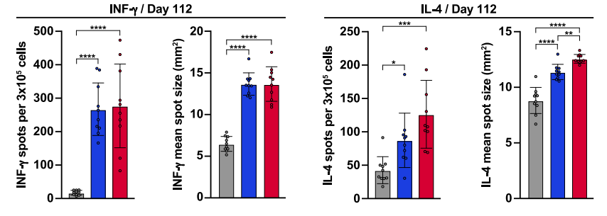 在第112天(增强后3个月),从免疫小鼠中分离脾细胞,通过酶联免疫吸附点(ELISpot)测定分析T细胞反应。用一组SARS-CoV-2 S特异性肽刺激脾细胞,并测量INF-g和IL-4的分泌以评估T细胞的活化。编码S和S-EABR构建体的mRNA LNP诱导了有效的INF-g反应,与S特异性细胞毒性CD8+T细胞和T辅助因子1(TH1)细胞免疫反应一致。相反,用纯化的S-EABR eVLP免疫的小鼠几乎检测不到INF-g反应。这些结果是预期的,因为mRNA LNP免疫导致S或S-EABR免疫原的细胞内表达和激活CD8+T细胞的抗原肽的MHC I类呈递,这在基于蛋白质纳米颗粒的疫苗中并不常见。