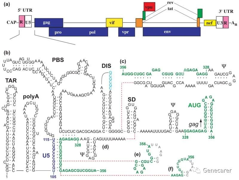HIV-1 5′-UTR主要包含TAR、polyA、PBS、DIS、SD和AUG片段