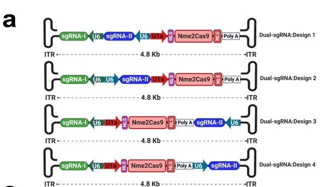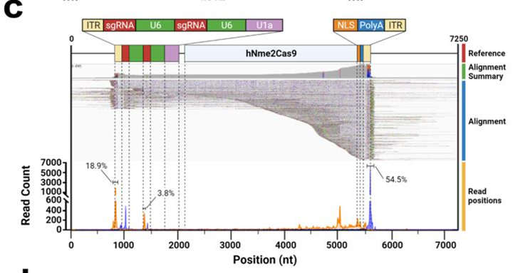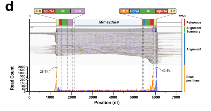 基于纳米孔的实时测序平台,测序数据显示,与主要包含从ITR到ITR的全长基因组的双sgRNA:Design 4载体不同,双sgRNA:Design 1产生了高频率的截短基因组。这些截断主要集中在两个位置,第一个定位在sgRNA表达盒上,产生只携带单个sgRNA的载体;第二个位于h Nme2 Cas9转基因的3′端。