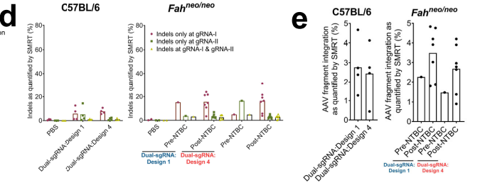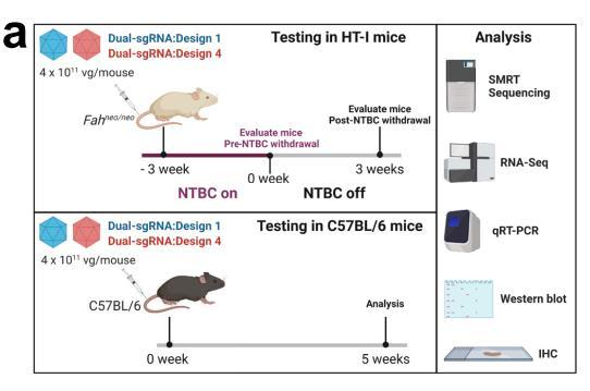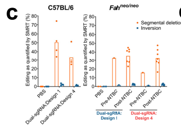 在C57BL/6小鼠中,为了不表现出编辑细胞的选择性增殖,用双sgRNA处理:设计1或4在两个靶位点之间分别产生50.5±8.7%和33.6±6%的节段缺失;在NTBC退出前分析的小鼠表现出33.3%(设计1)和15.8%(设计4)的节段缺失效率。NTBC停药和选择性肝细胞扩增三周后,载体设计1和4分别产生35.7±3.3%和33.2±4%的节段缺失。