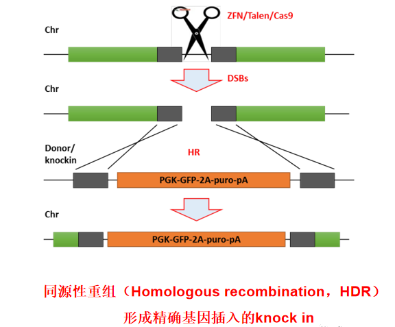 采用CRISPR/Cas9系统进行目的基因(外源基因,抗性基因和荧光标志等)的定点敲入,是通过提供外源模板(Donor载体)依靠细胞自身的修复机制NHEJ(非同源末端连接)和HDR(同源同组)完成的。在哺乳动物细胞中,CRISPR/Cas9介导的NHEJ对标记基因的插入概率明显高于HDR修复机制。