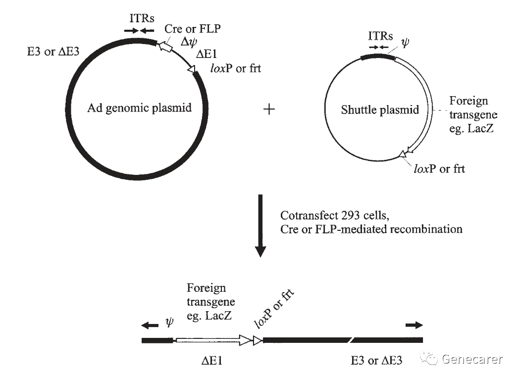 FLP-frt重组系统进行腺病毒基因组重组的包装系统,该系统由pHBAd系列穿梭质粒、腺病毒骨架质粒pBHGlox(delta)E1, 3Cre双质粒组成。缺失的 E1 基因在组装感染性病毒颗粒时由 293A 细胞提供,被删除的E3基因不影响病毒的包装,因此可插入高达 7.5kb 的外源基因,双质粒共同转染293A细胞。
