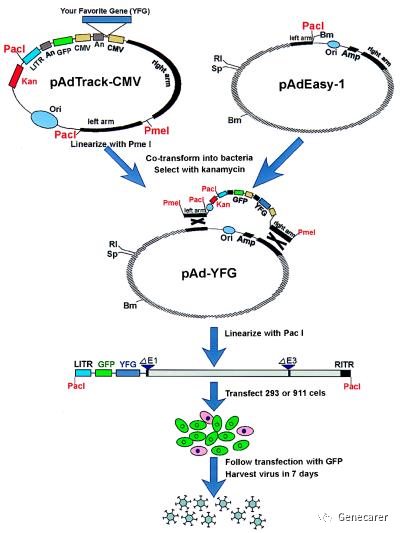 第五步:线性化质粒回收后转染293A细胞,产生重组病毒颗粒,收毒,后续纯化浓缩。