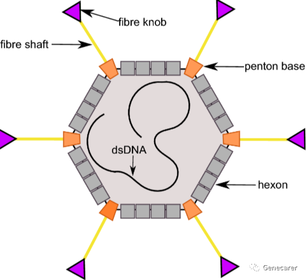 腺病毒为20面体立体对称结构,由252个壳粒组成,衣壳含有240个六连体(Hexon),12个五连体(penton)和位于表面的纤维状刺突,纤维状刺突由12根纤毛(fiber),以5连体单位为基底由衣壳表面伸出,纤毛顶端形成头结区(Knob),在病毒感染细胞过程中起着非常重要的作用。纤毛的头节区粘附到细胞表面的特异性受体介导的内吞作用进入细胞,而后腺病毒基因组转移至细胞核内,游离于染色体外,但不整合进入宿主细胞基因组。腺病毒已知有52种,分别命名为adl-ad52,研究得最详细是ad2和ad5,广泛应用于疫苗和体外体内基因转导等领域。