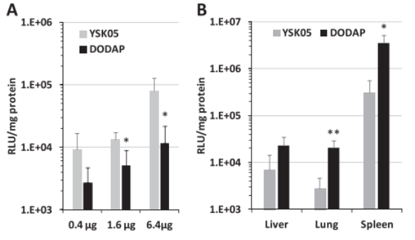 图1.YSK05-和DODAP-LNPs体外和体内转染活性的比较