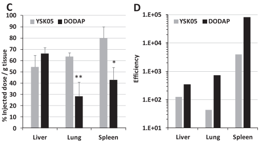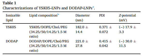 (3)进一步了解DODAP-LNP体内转染效果好的原因,做了两种LNP的表征分布(表1)。荧光素酶活性除以递送到每个组织的LNP量来计算基因表达效率。结果表明YSK-LNP优先递送至脾脏,递送量高于DODAP-LNP 。DODAP-LNP递送到肝脏的量高于脾脏(图1C)。
