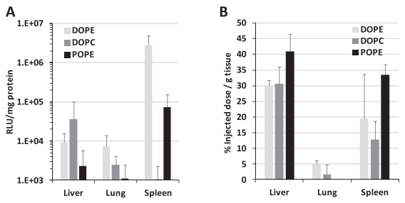 作者验证辅助脂质(DOPE)可能是 DODAP-LNP 的重要组成部分,选择(DOPE、二油酰磷酸胆碱(DOPC)或1-棕榈酰-2-油酰磷酸乙醇胺(POPE))制备了不同的DODAP-LNP。做了荧光素酶活性和生物分布实验。