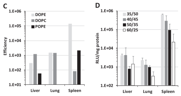 (1)对比了DODAP/DOPE比例在 35/50 至 60/25 范围内的影响发现与肝脏和肺脏相比,所有比例的LNP在脾脏都显示出最高活性,但随比例增加活性降低(图 2D)。
