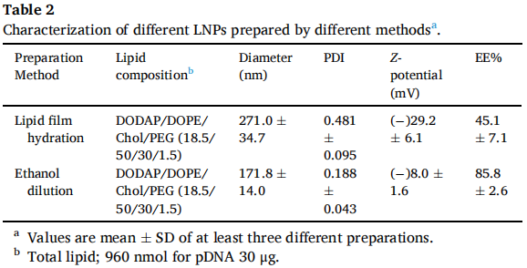 (3)验证了DODAP/DOPE更广泛比例的活性,脾脏活性在15/70至35/50范围内达到上限, 15/70比率是脾/肝的最大活性比(图2G)。以上数据表明 DODAP 和 DOPE 的组合是LNP靶向脾脏的重要因素。为了扩大LNP的制备规模并获得更好的pDNA封装效率,比较了脂质膜水合与乙醇稀释。稀释法制备的LNP负电荷较低,pDNA封装较高,LNP更加均一(表2)。
