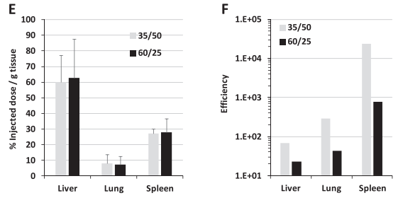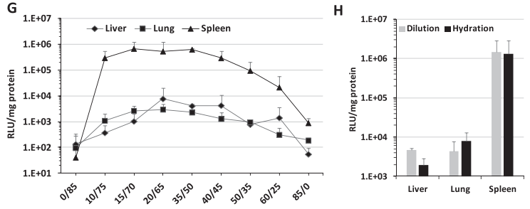 (2)比较了活性差异最大比例LNP的生物分布(DODAP/DOPE = 35/50 与 60/25),发现两中LNP生物分布无明显差异,但比例较低LNP的基因表达效率高(图 2E,F)。