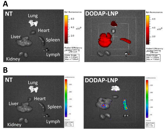 作者使用离体成像检查了包括淋巴结在内的不同器官中的分布和基因表达(荧光素酶活性),确定乙醇稀释法制备的DODAP-DOPE-LNP靶向脾增强基因表达。