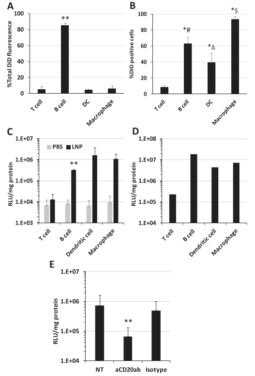 作者检测了LNP分布到脾细胞的类型,确定基因高效表达的机制。使用特异性抗体来确定分布的脾细胞类型(T 细胞、B 细胞、DC 和巨噬细胞)