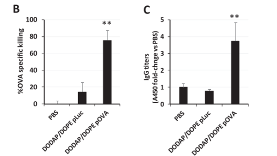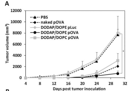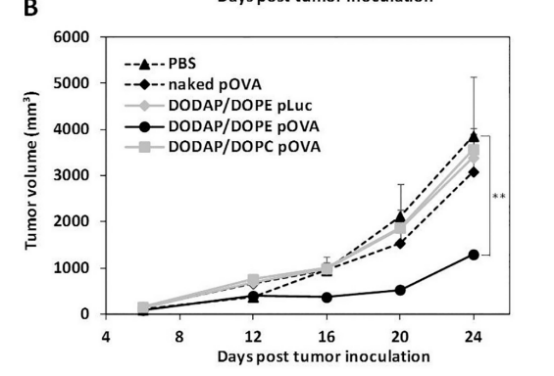 图6.包封抗原(OVA)编码pDNA的不同DODAP-LNP预防和治疗抗肿瘤作用