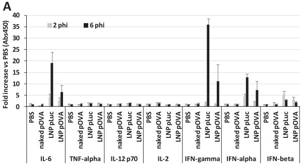 检测了DODAP-LNP治疗后的免疫反应,结果表明:注射后2h和6h血清结果发现IL-6、IFN-α、β、IFN-γ的LNP-pLuc和LNP-pOVA可诱导更高的血清细胞因子产生,pDNA或PBS为对照(图7A)。IL-6、IFN-γ和IFN-α做了抗原特异性细胞毒作用和抗原特异性抗体产生实验。结果表明:含有非特异性CPG的pLuc质粒比不含CPG的pOVA质粒产生更高的细胞因子。
