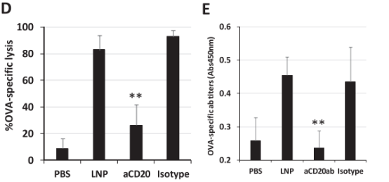 LNP-pOVA产生强OVA特异性细胞毒性T淋巴细胞(CTL)活性和强OVA特异性IgG抗体滴度(图7B,C)。验证了B细胞参与抗肿瘤免疫反应,在存在或不存在特异性抗体的情况下测量OVA特异性CTL活性和OVA特异性IgG抗体滴度(aCD20),aCD20会消耗B细胞。aCD20抗体的显着降低CTL活性和抗体产生(图7D,E),表明B淋巴细胞是负责免疫反应的主要细胞,无论是先天性免疫还是适应性免疫。结果表明,脾脏中的B细胞是肿瘤特异性免疫刺激的重要靶标。