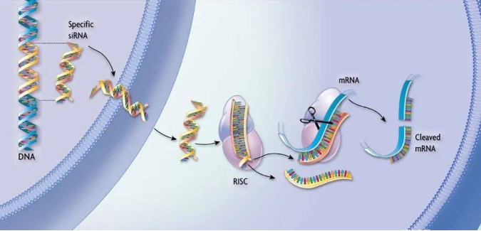 外源性或内源性双链RNA(dsRNA)被RNaseIII(例如Dicer)切割成约21-25nt具有活性的siRNA结构。随后,Dicer将在RNA结合蛋白TRBP的帮助下将双链siRNA加载到Argonaute(AGO2)蛋白,形成复合体(RNA-induced silencing complex,RISC)。然后,siRNA将解开双链,其反义链与靶mRNA结合后,AGO2将特异性降解靶mRNA,从而抑制其翻译。最后,被切除的靶mRNA被释放,RISC被回收,使用相同的加载引导链再进行几轮靶向降解。此外,siRNA可以在RNA聚合酶的作用下再次形成dsRNA,从而重新参与以上过程。