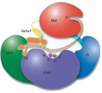 RISC中发挥沉默靶基因作用的主要部分是Argonaute蛋白(AGO2)。为了实现siRNA介导的沉默,AGO2需要连接siRNA反义链,切掉随从链,随后在保持与反义链结合的情况下,经历多个靶mRNA识别、切割和释放循环。AGO2具有三个功能域,PAZ、MID和PIWI,其中PIWI结构域具有RNaseH样的折叠情况,是赋予其切割活性的功能域。PAZ结构域具有RNA结合作用,能够识别单链RNA的3’端,起到了铆定向导链的3’端的作用,5'端则插入MID和PIWI结构域之间,从而便于PIWI结构与实现切割功能。