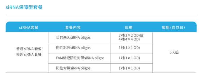 基恩科(Genecarer)生物RNAi的服务包括单条siRNA定制、三保一套餐(定制三条siRNA且保证其中至少一条能够实现良好的敲减效果)、四保一套餐等。由于siRNA有一定的脱靶率,且其敲减效率可能与具体的靶向序列有一定关系,因此,除非有在可靠文献上找到详细的siRNA序列,否则,建议直接选择三保一或四保一套餐。